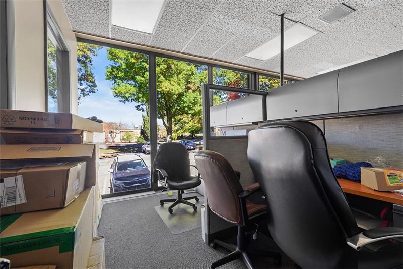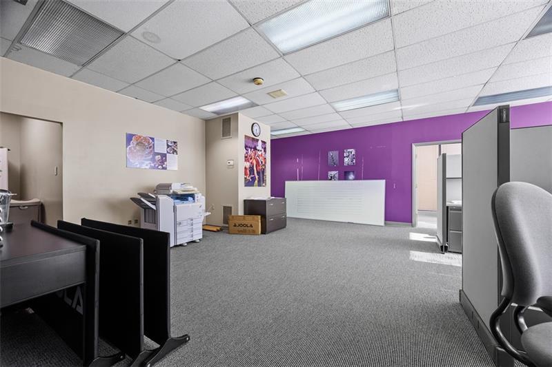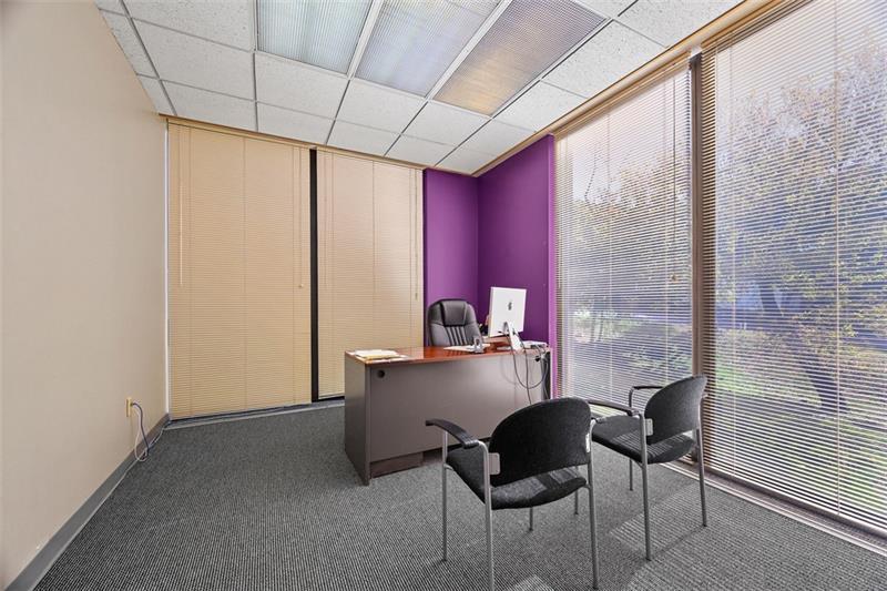 5,000 SF renovated office space with two open work areas (including dividers), eight private offices, a large conference room, and ample storage. The lower level includes a finished warehouse area and open space with a dock door; the dock provides truck turnaround for easy logistics. Full temperature control with newer HVAC units; flat roof inspected/cleaned annually; 3-phase power. Handicap ramp at entrance; situated on 2 acres with 28 parking spots and room for expansion. The building architect was Tasso Katsalas, an understudy of Frank Lloyd Wright.