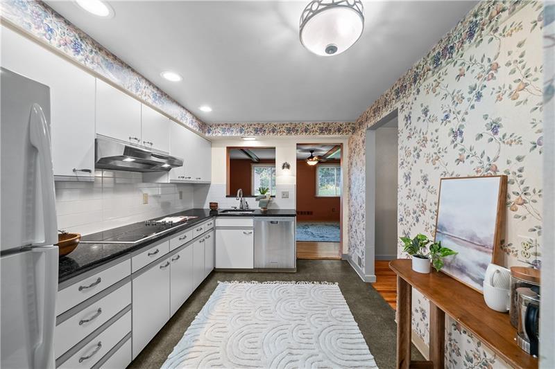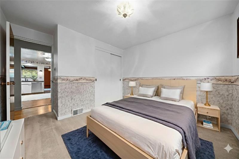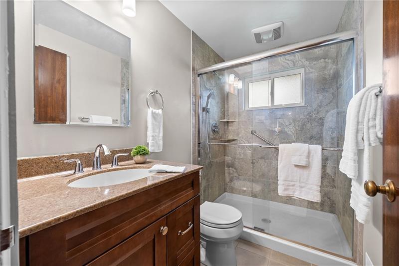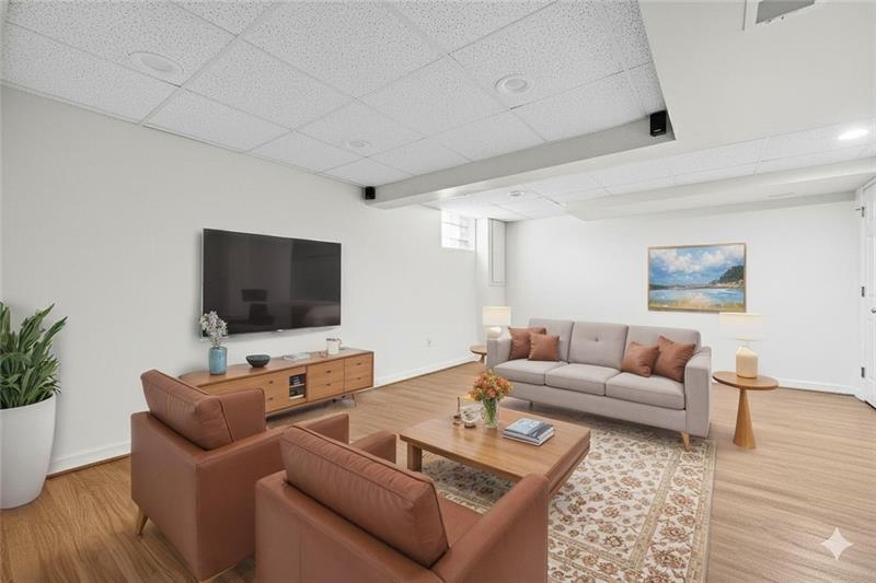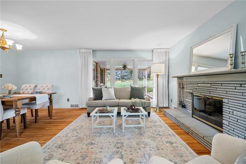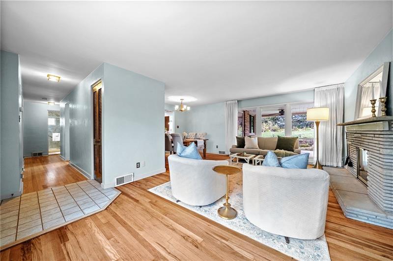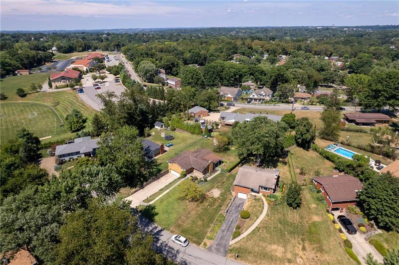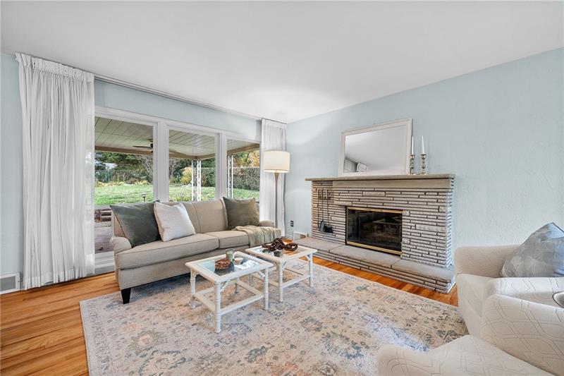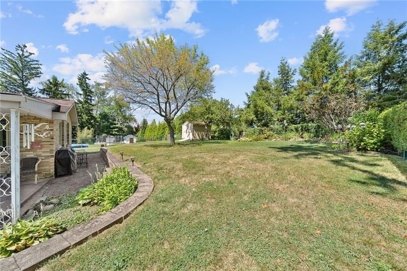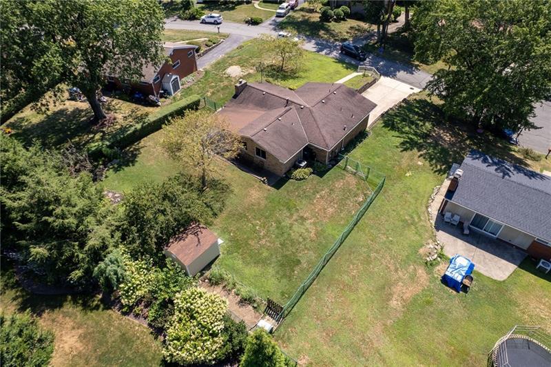 Located on a quiet cul-de-sac in Upper St. Clair, this spacious brick ranch sits on a manicured, fenced-in lot. The large living room features a gas fireplace, hardwood flooring, and two picture windows. The kitchen offers white cabinetry, granite countertops, and opens to a generous family room addition with hardwood floors, wall-to-wall closet storage, views of the flat backyard, and access to the covered porch. Hardwood floors lie beneath the existing carpeting throughout the bedrooms. The primary bedroom includes a private half bath, while the hall bath features a luxurious walk-in shower. The finished lower-level game room provides extra living space, and the oversized laundry room offers ample storage. A second half bath and a massively oversized 2-car garage complete the lower level. Notable features include a 40-year roof, Anderson awning windows, a new shed, and more. Don't miss this rare opportunity!