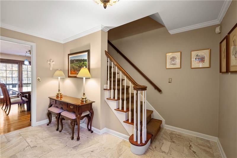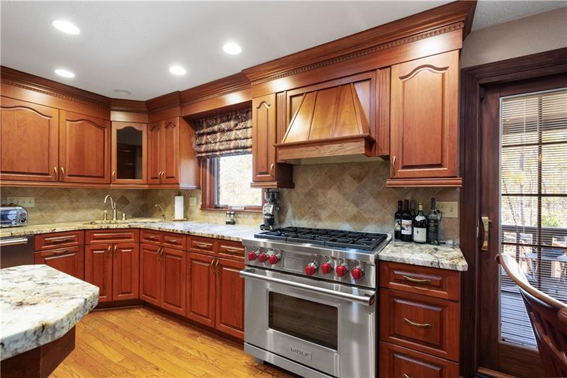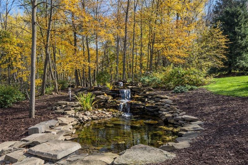 Exceptional Custom Home with Timeless Elegance & Thoughtful Design. Welcome to this beautifully crafted 4-bedroom, 3.5-bath residence offering refined finishes, exceptional living spaces, professionally landscaped, and a private backyard retreat. From the inviting covered front porch to the tiered deck overlooking a serene pond, this home blends classic charm with modern comforts. Step through the solid mahogany wood front door into a travertine marble foyer that sets the tone for the elegance found throughout. The living room features rich hardwood floors, crown molding, and a picture window with a display shelf. The formal dining room showcases crown molding, chair rail, wainscoting, hardwood floors, and a second picture window, creating an ideal setting for entertaining. The classic kitchen is a chef's dream with cherry raised-panel cabinetry, granite countertops, a 6-burner Wolf gas range, Sub-Zero refrigerator, warming drawer, newer Cove dishwasher, ceramic tile backsplash, and pantry cabinets with pull-out drawers. The sunlit eating area opens through a Pella sliding door to a covered rear porch and tiered deck, offering easy access to the private backyard, pond, and oversized driveway. The family room is warm and inviting with hardwood floors, a brick-to-ceiling wood-burning fireplace with wood storage, beamed ceiling, bay window, and a built-in wet bar with shelving"”perfect for relaxing or hosting guests. The powder room features travertine marble wainscoting, a decorative sink, and raised vanity. A hardwood staircase with a newer carpet runner leads to the second floor. The luxurious primary suite includes a brick-to-ceiling wood-burning fireplace, beamed ceiling, walk-in cedar closet with custom shelving, and a private loft area for work or relaxation with attic storage. The spa-inspired primary bath boasts a heated marble floor, oversized steam shower with L-shaped seating, double vessel sinks, raised vanities, a linen closet, and a convenient pocket door. All second-floor carpeting is newer and neutral. Bedroom two offers a laundry chute and generous closet space. Bedroom three features dual closets and a second loft area for work or play with additional attic storage. Bedroom four includes a spacious closet and a bay window with a display shelf. The finished basement adds even more recreational space with a gas fireplace, ceramic-tiled entry from the rear yard, a full bath with stand-up shower, and multiple storage closets. Additional highlights include a two-car garage, two lofts for extra living and storage space, newer windows and roof, professionally landscaped, sprinkler system, newer HWT, aggregate driveway, walkways, and patio, and wiring for a future hot tub. The laundry room includes an extra freezer, and washer and dryer. This exceptional home offers a rare combination of craftsmanship, comfort, and privacy"”perfect for those seeking a distinctive property with timeless appeal.