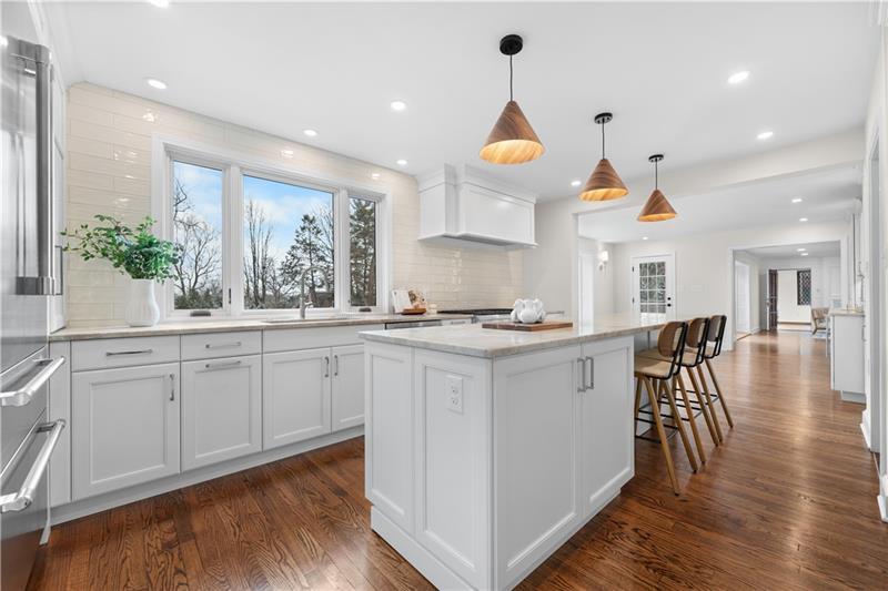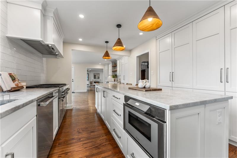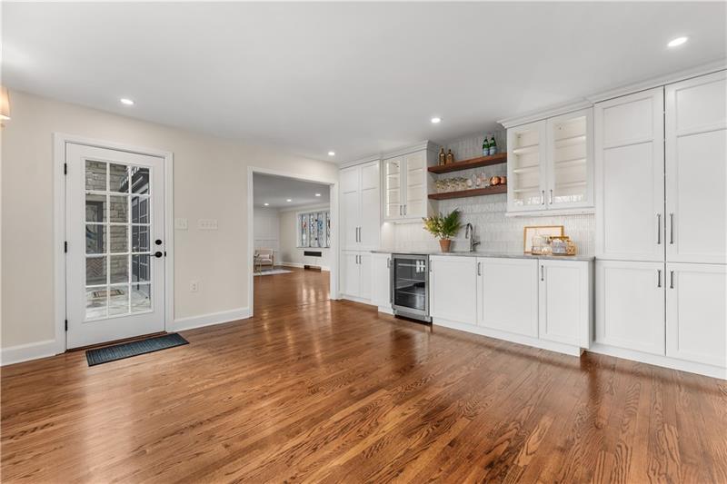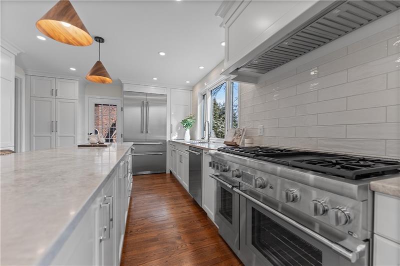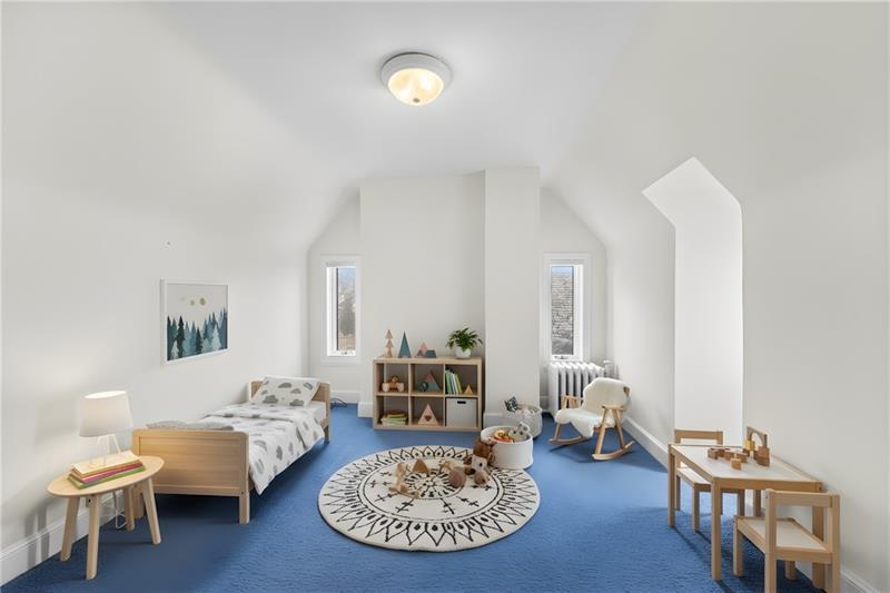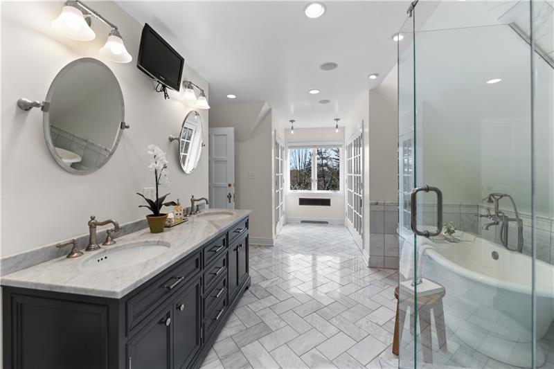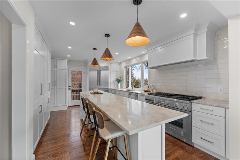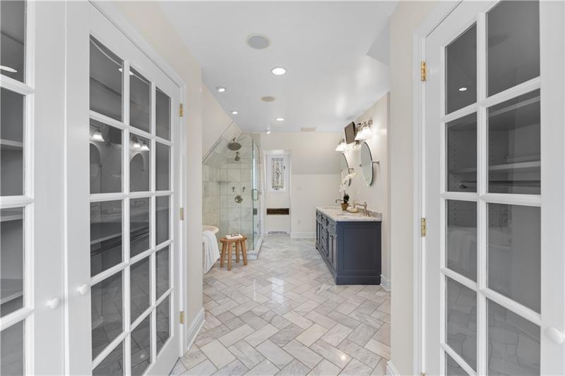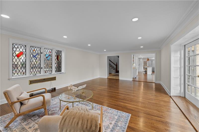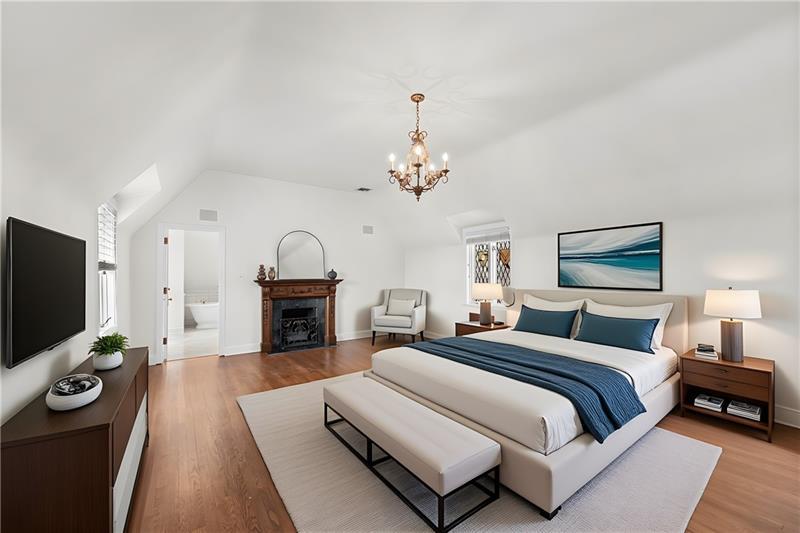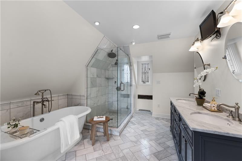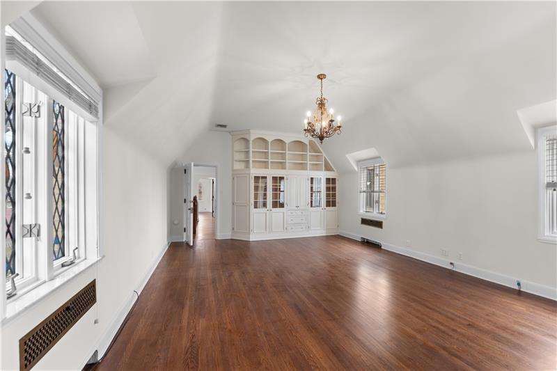 Stately 1932 stone Tudor showcases timeless craftmanship with beautiful stained glass windows, classic stonework and gracious living spaces throughout. Lovingly maintained and beautifully cared for, this special home reflects true pride of ownership. WELCOME through original detailed front wood door into two story entry featuring grand staircase with large stained glass window. Dual staircases-a grand front and a private rear staircase offer convenience throughout the home. First floor living has wonderful flow. New chef's kitchen with top of line appliances with center island and ample cabinet space. Wet bar in dining area open to kitchen perfect for family gatherings. Great flow on main floor from kitchen to dining to living room and family room all along back of home with large windows and doors letting in the sun! Front of house has a private office with dark wood and fireplace. An impressive back flagstone patio overlooks the expansive, level and private backyard, creating a serene outdoor retreat perfect for entertaining. Oversized primary suite with stunning Restoration Hardware- spa-like bath with an elegant soaking tub and oversized walk-in shower, blending timeless design with modern comfort. Spacious four bedrooms on second level and fifth bedroom on third floor with full bath. Could be a guest suite or in-law suite. Lower level boast of finished family room with fireplace a nice large cedar closet and laundry/furnace room. Additional highlights included a rare six car garage, generous room sizes and a premier Mt Lebanon location.